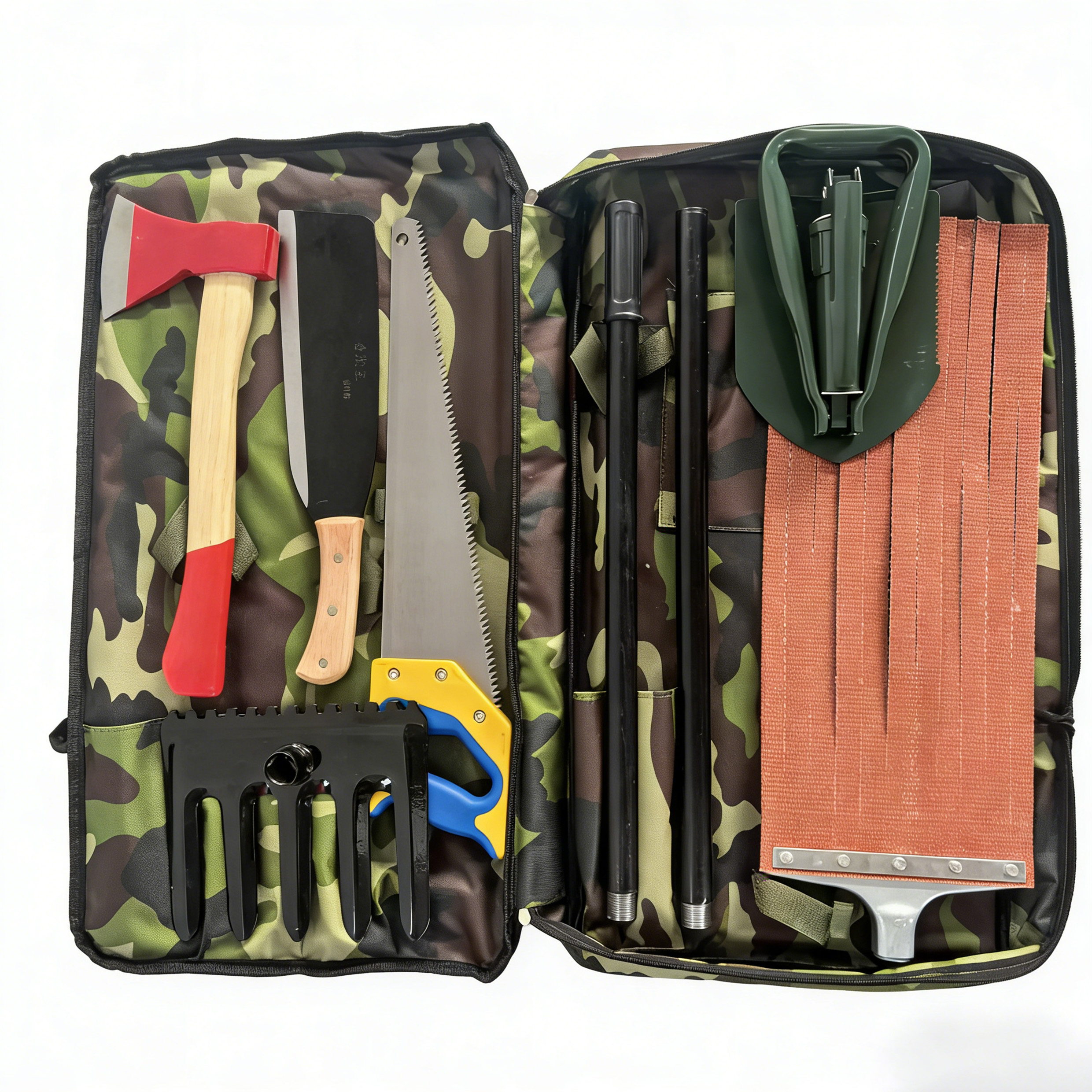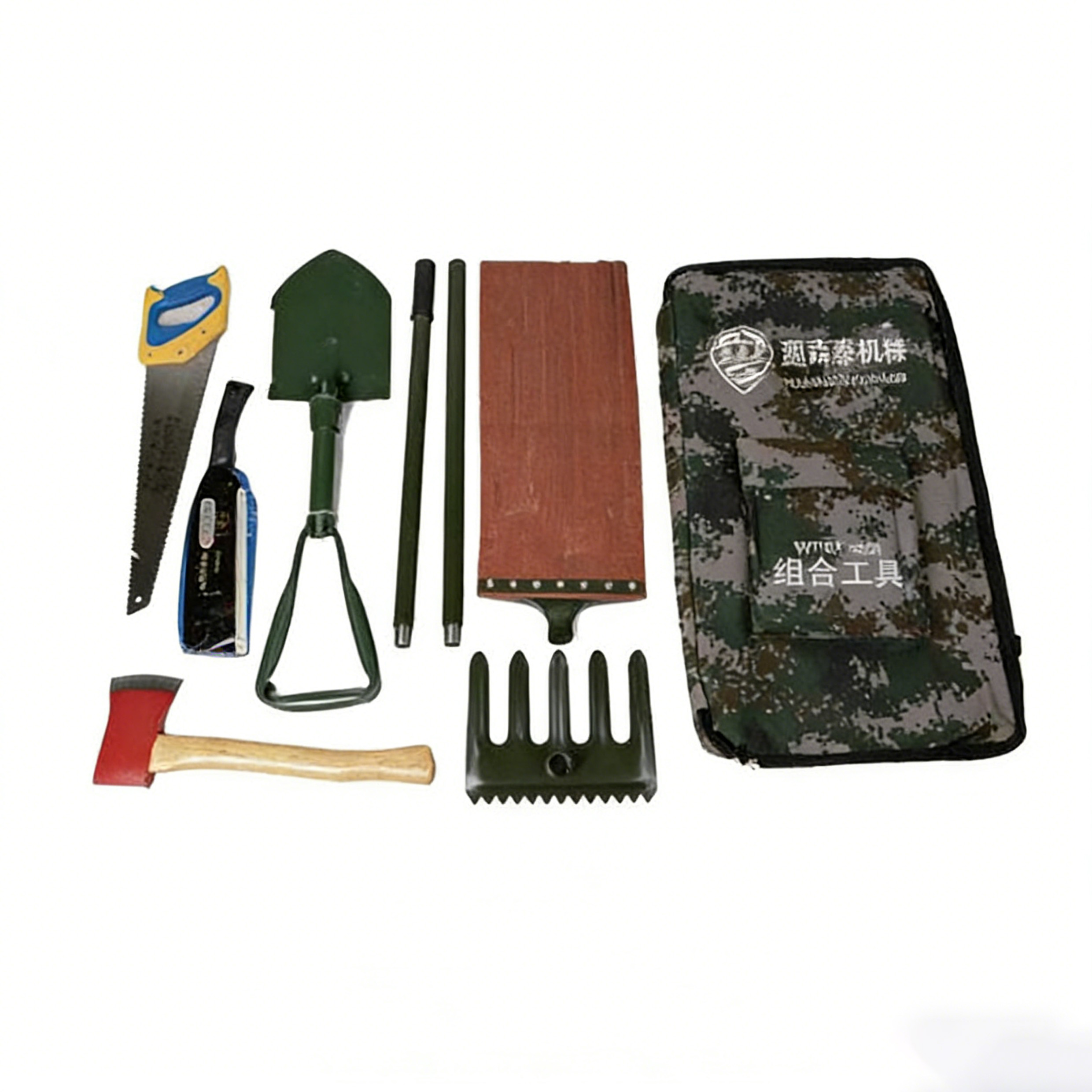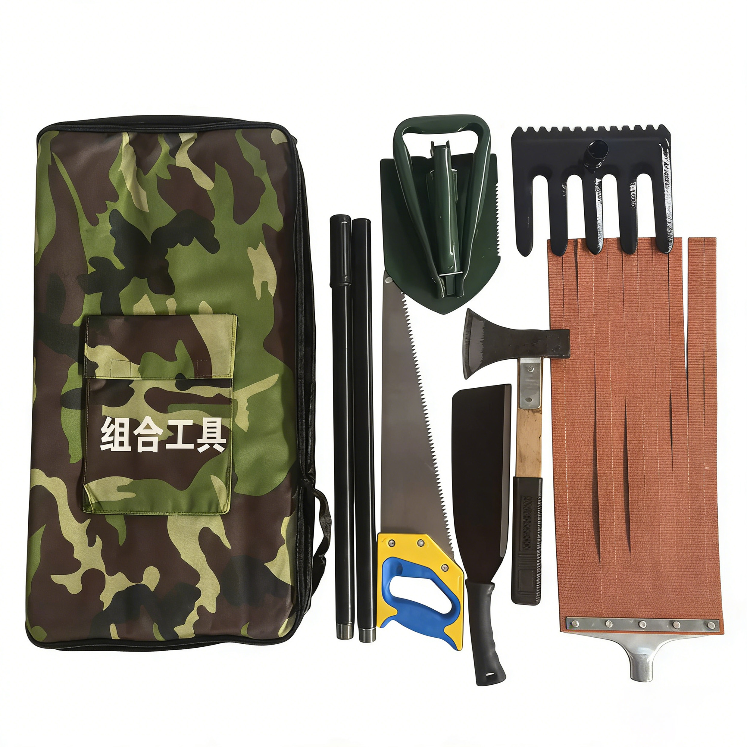 组合工具为森林防火实用最普遍的工具组有八件套、七件套工具组内含有砍刀、斧头、军工铲、五齿耙、手锯、灭火拍两个连接杆、伸缩杆、军镐等工具;