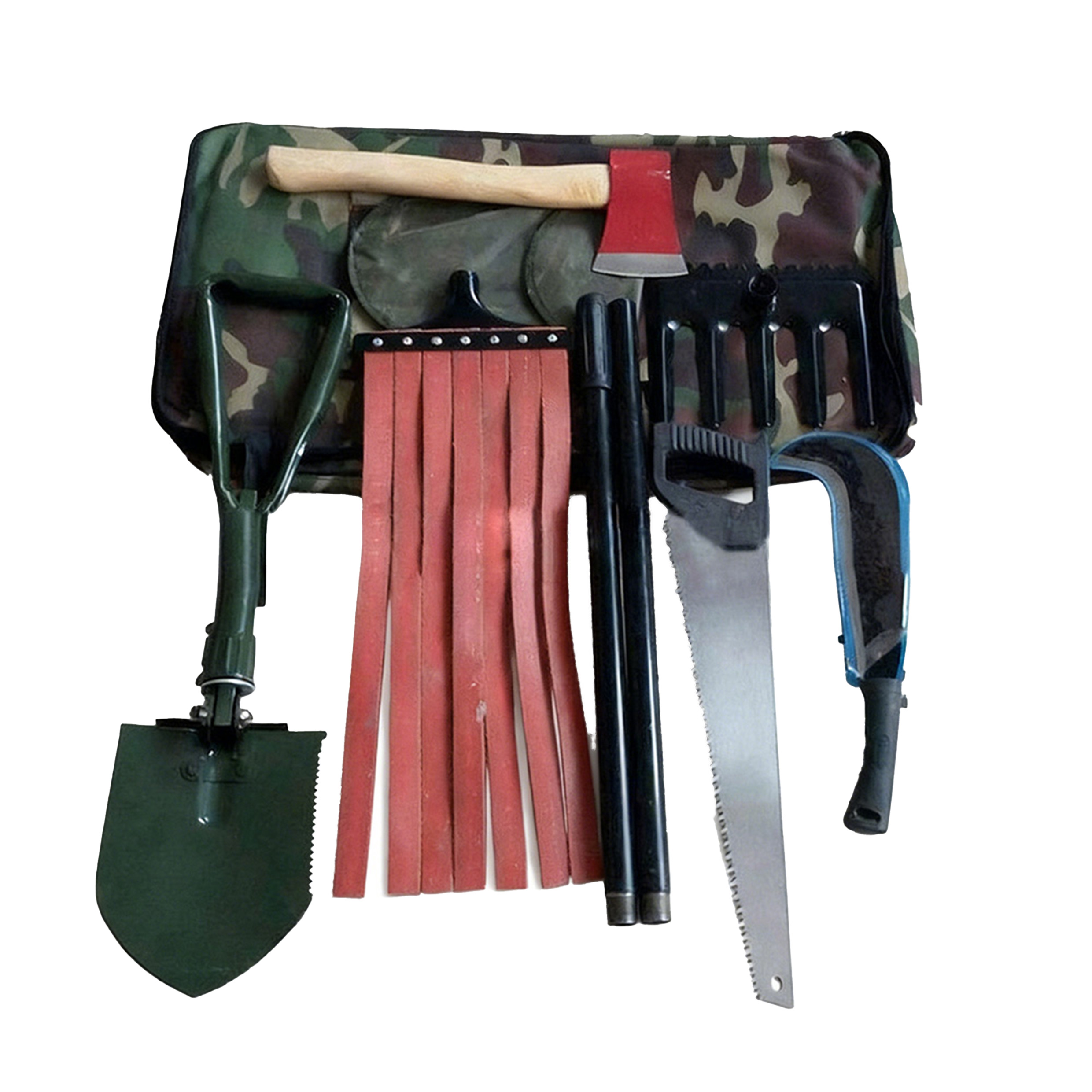 1馑单工具杆采用新型设计,工具包采用涤纶涂层织物,防水性强:2、工具由:砍刀、锯、斧头、锹、扑火拍、五齿耙、连接杆、工具背包共8件组成: