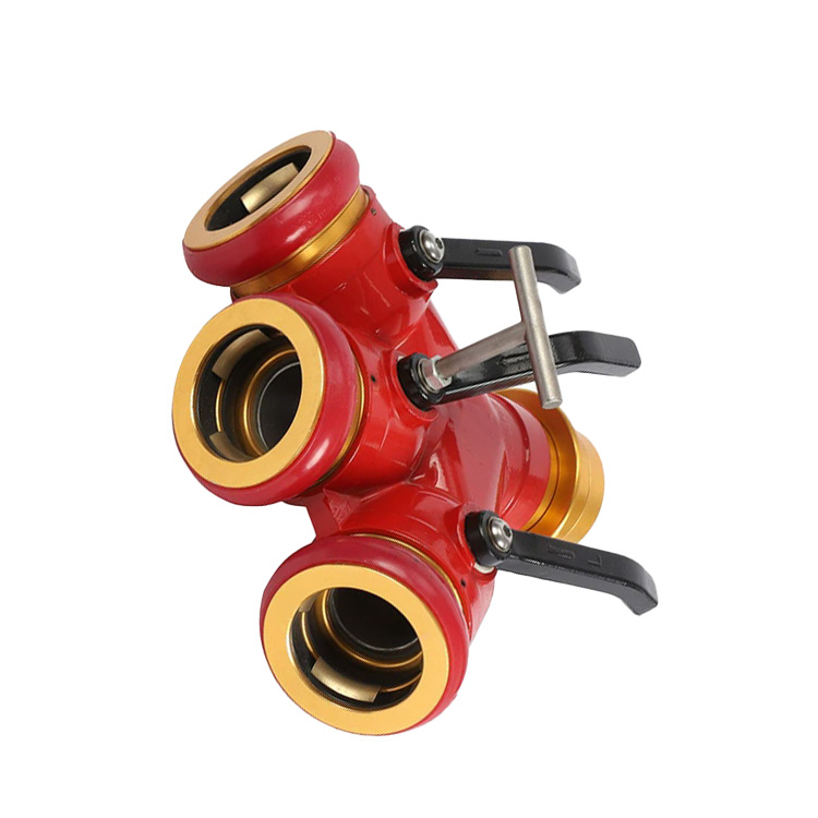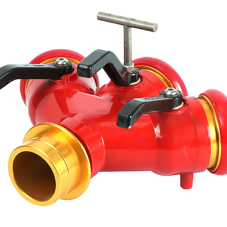 有一个进水口,三个出水口,可以随时关闭,控制水流,便于增加和调换支线水带,主要用于铺设消防水带用,是从水带干线分出水带支线的消防器材,他的主要材料为铝镁合金,由本体,锻压接口等组成。本体材质:铝合金ZL104,接口材质铝合金6061。本体表面经过喷塑处理,接口经过阳极氧化。工作压力:2.5Mpa,进水口径:80mm,出水口径:3×65mm,阀门开启力74.5N。重5.5KG
