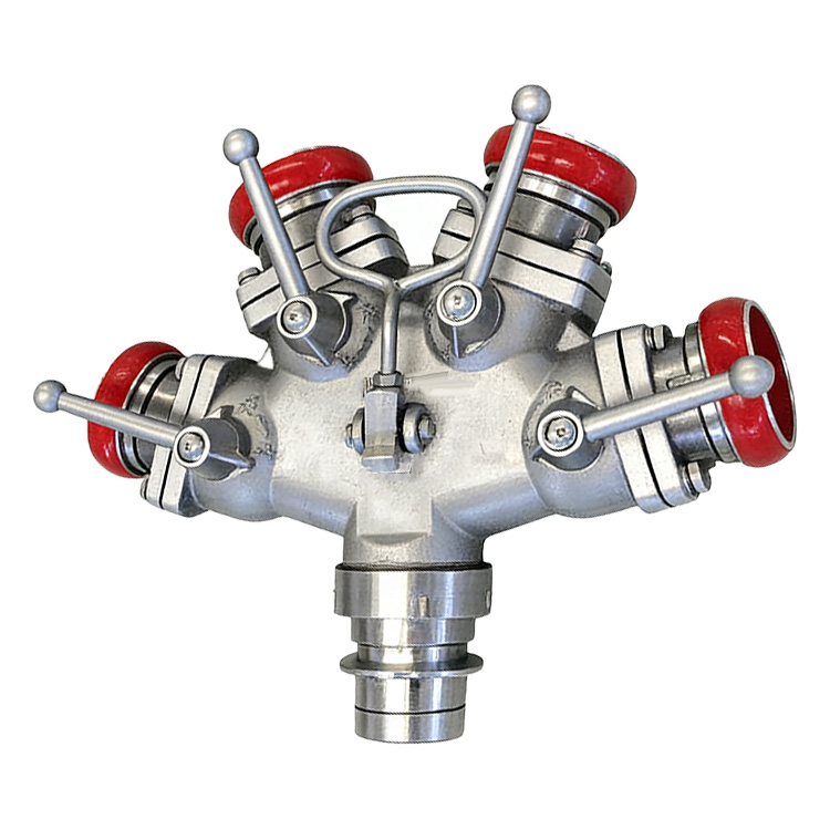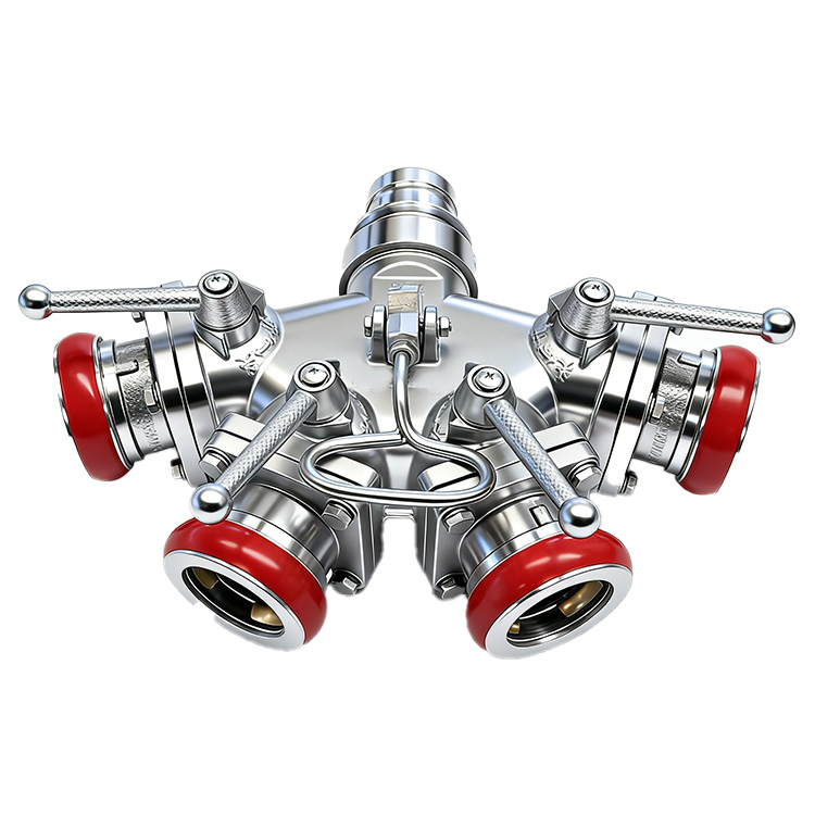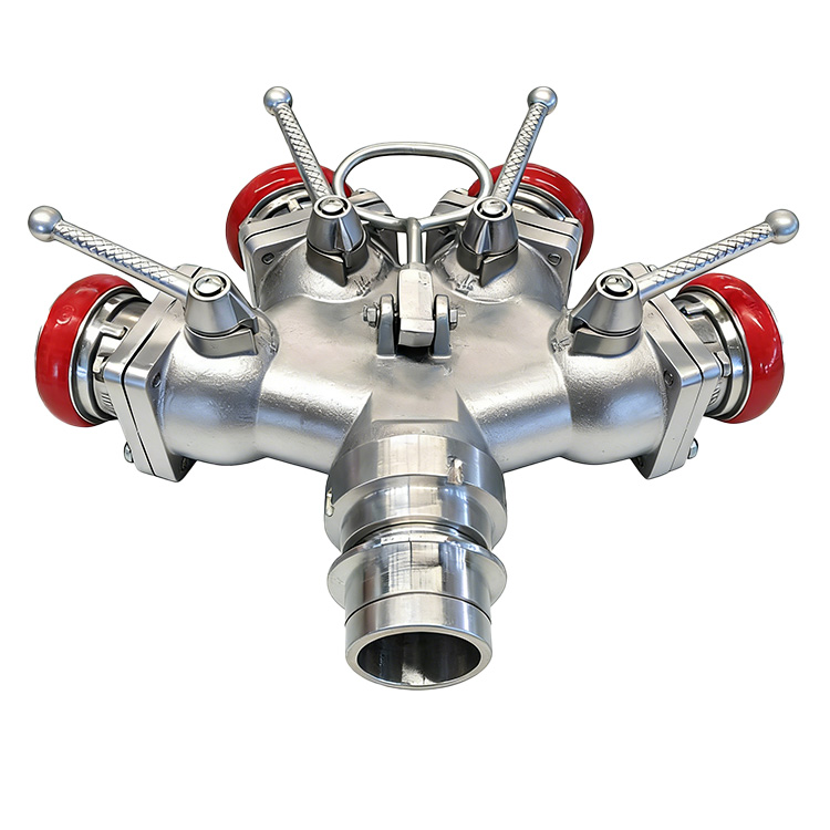 一个进水口,四个出水口,可以随时关闭,控制水流,便于增加和调换支线水带.主要用于铺设消防水带用,是从水带干线分出水带支线的消防器材,他的主要材料为铝合金,由本体阀,接口等组成。工作压力:1.6Mpa,进水口径:80mm,出水口径:4×65mm。接口可接快速接口与内扣接口