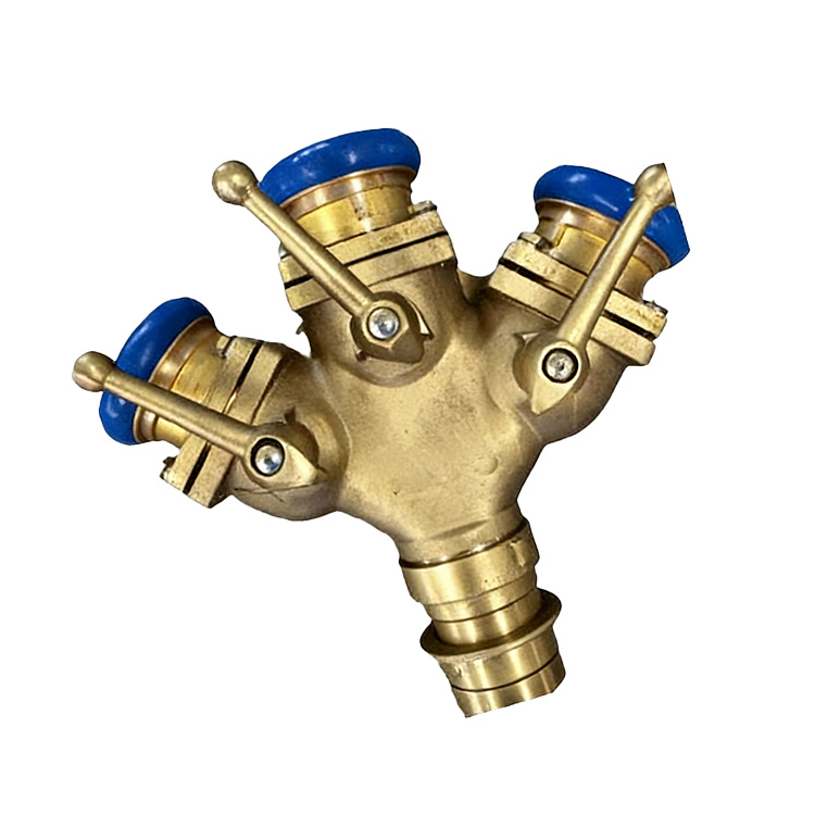 分水器由纯铜铸造而成,有一个进水口,三个出水口,可以随时关闭,控制水流,便于增加和调换支线水带.主要用于铺设消防水带用,是从水带干线分出水带支线的消防器材,他的主要材料为铜合金,由本体阀,接口等组成。工作压力:2.5Mpa,进水口径:80mm,出水口径:3×65mm。